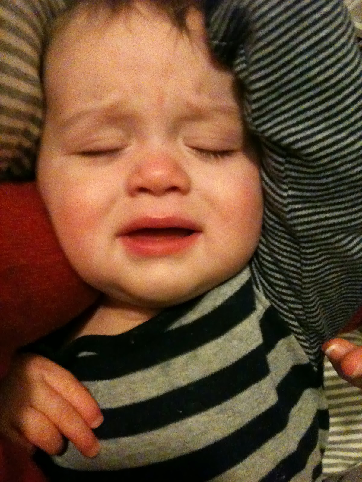 Koortsig, moe en niet willen/kunnen slapen. Dan maar bij mama op de bank onder een lekker dekentje. Uiteindelijk kon ik hem slapen wegleggen in bed.